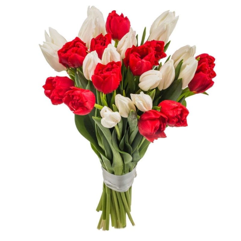 Букет состоит из 10 белых тюльпанов, 9 красных тюльпанов, прозрачная упаковка, атласная лента.