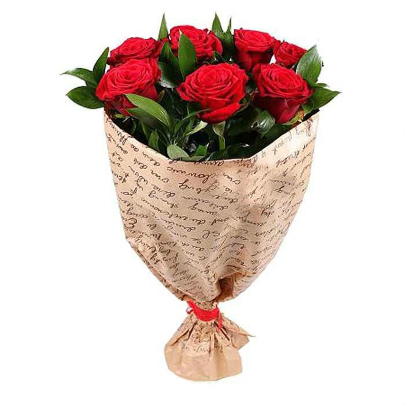 Букет состоит из 7 красных роз, зелень, крафт, красная лента.